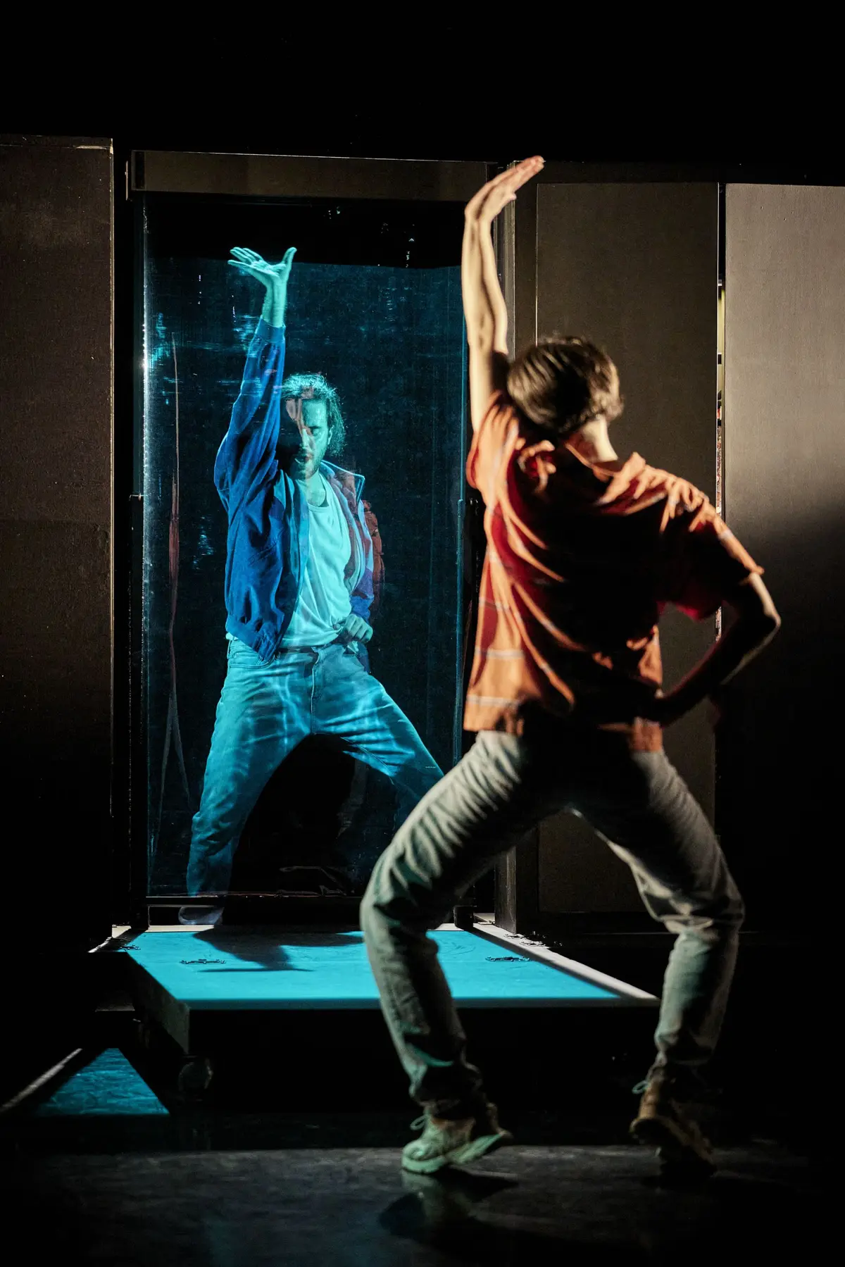 Sur scène, sous le regard attentif de leur aîné, deux jeunes danseur.ses en quête d'eux-mêmes explorent leurs corps en mue. En recherche de leur identité, ils se heurtent à leur propre reflet, bientôt démultiplié et modifié par l'omniprésence des réseaux sociaux. Leur chambre, sanctuaire de leur intimité, se métamorphose peu à peu en un espace virtuel qui leur accorde le pouvoir d'être qui ils veulent, en mieux. Dans leur palais de miroirs qui se transforme progressivement en dédale numérique, ils tentent de trouver leurs voi(es)(x).
