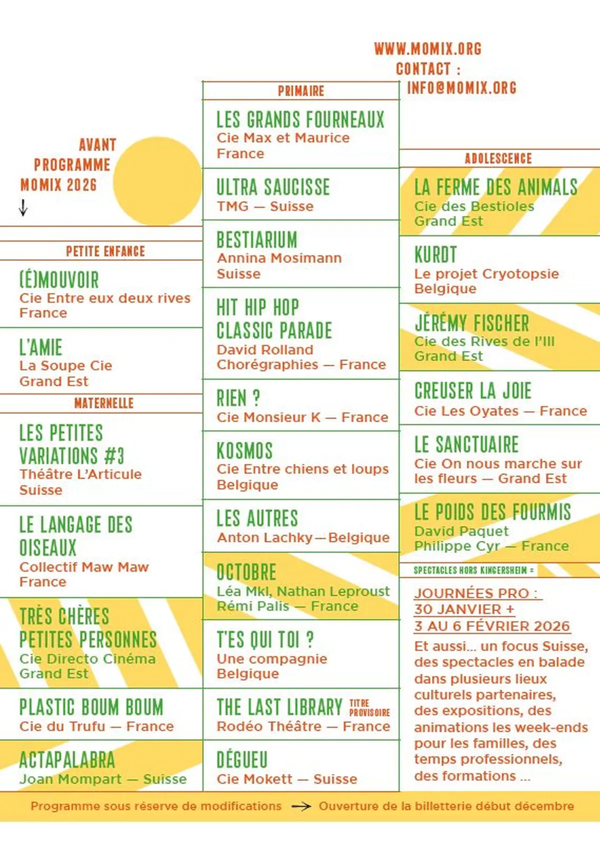 Le programme complet du festival Momix 2026 est à retrouver sur le site officiel de l’événement.