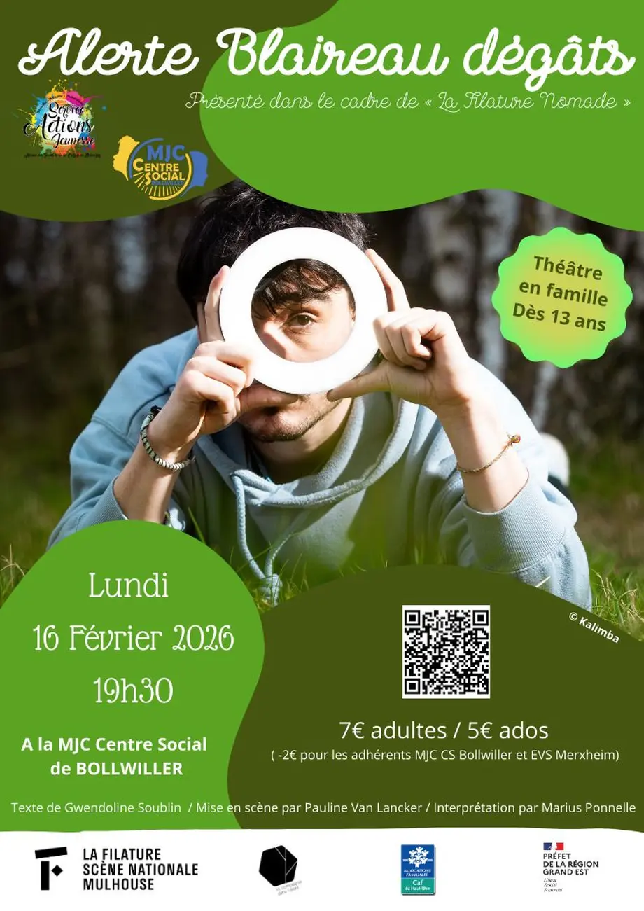 La MJC Centre Social de Bollwiller accueille cette création originale qui suit l'histoire d'un jeune homme déterminé à défendre les blaireaux menacés de son territoire. Face à leur disparition, il lance la chaîne YouTube "Alerte Blaireau dégâts" pour sensibiliser le public à cette cause environnementale.