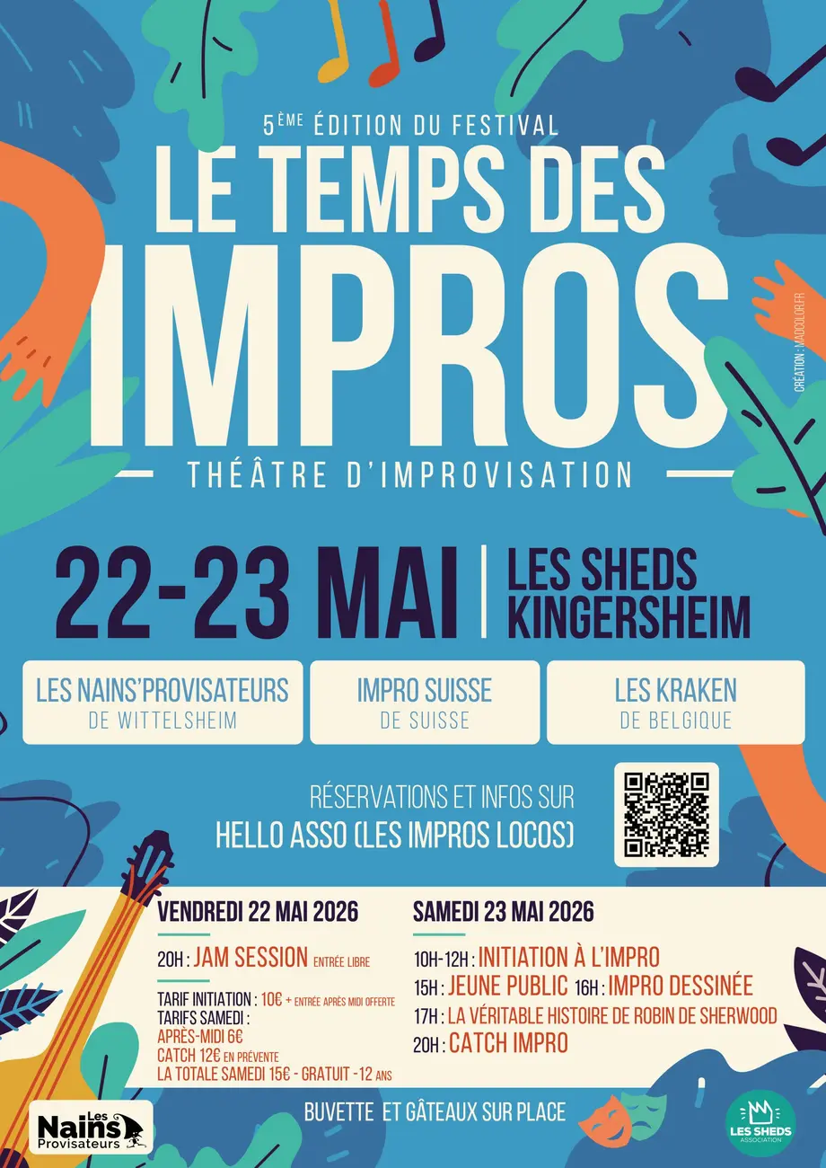 Pour sa 5ème édition, le « Temps des Impros » revient aux Sheds de Kingersheim avec son esprit original. Lors de ces deux journées, venez (re)découvrir l’improvisation théâtrale sous toutes ces formes. Avec de supers invités (Suisse et Belgique) mais aussi des équipes alsaciennes, des concepts originaux et du catch impro, le tout dans un esprit de bonheur ambiant !