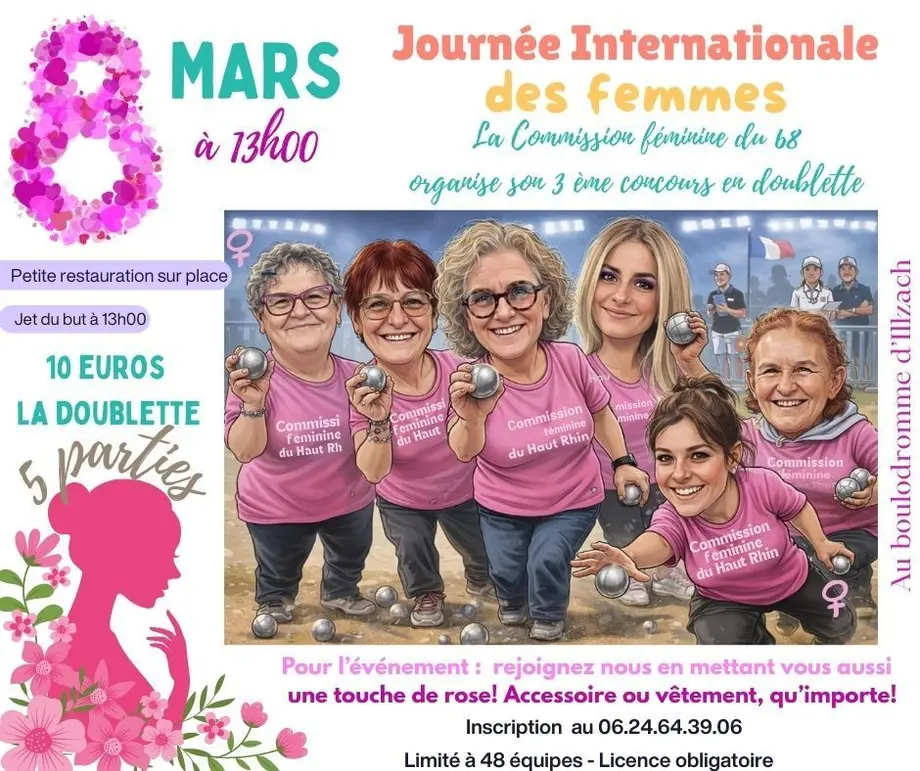 La Commission Féminine du 68 organise son 3ème concours de pétanque exclusivement dédié aux femmes le dimanche 8 mars 2026 au Boulodrome d'Illzach. Cette journée spéciale célèbre la Journée internationale des droits des femmes à travers un tournoi convivial ouvert aux joueuses du département et des régions voisines.
