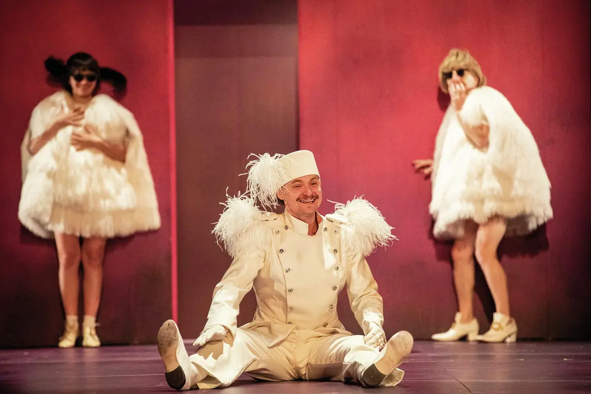 Pensé comme un “spectacle total” d’environ 3h, le vaudeville est revisité avec une scénographie ample et un rythme effréné : 13 comédiens emportés dans un tourbillon d’adultères, de quiproquos et d’absurde, à la frontière du délire.