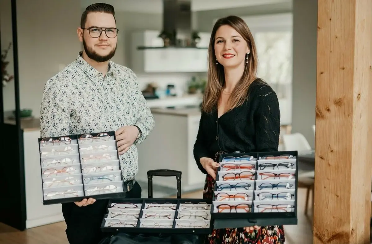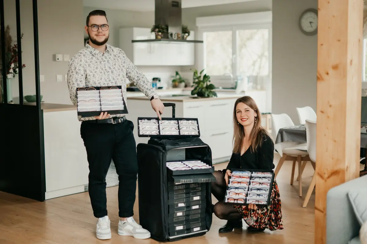 Depuis 2015, Camille et Léo se déplacent à domicile chez les particuliers, sur leur lieu de travail, dans les hôpitaux, les maisons de retraite, etc… Dans leurs valises, plus de 600 paires de lunettes de toutes marques et toutes gammes de prix pour les hommes, femmes et enfants.