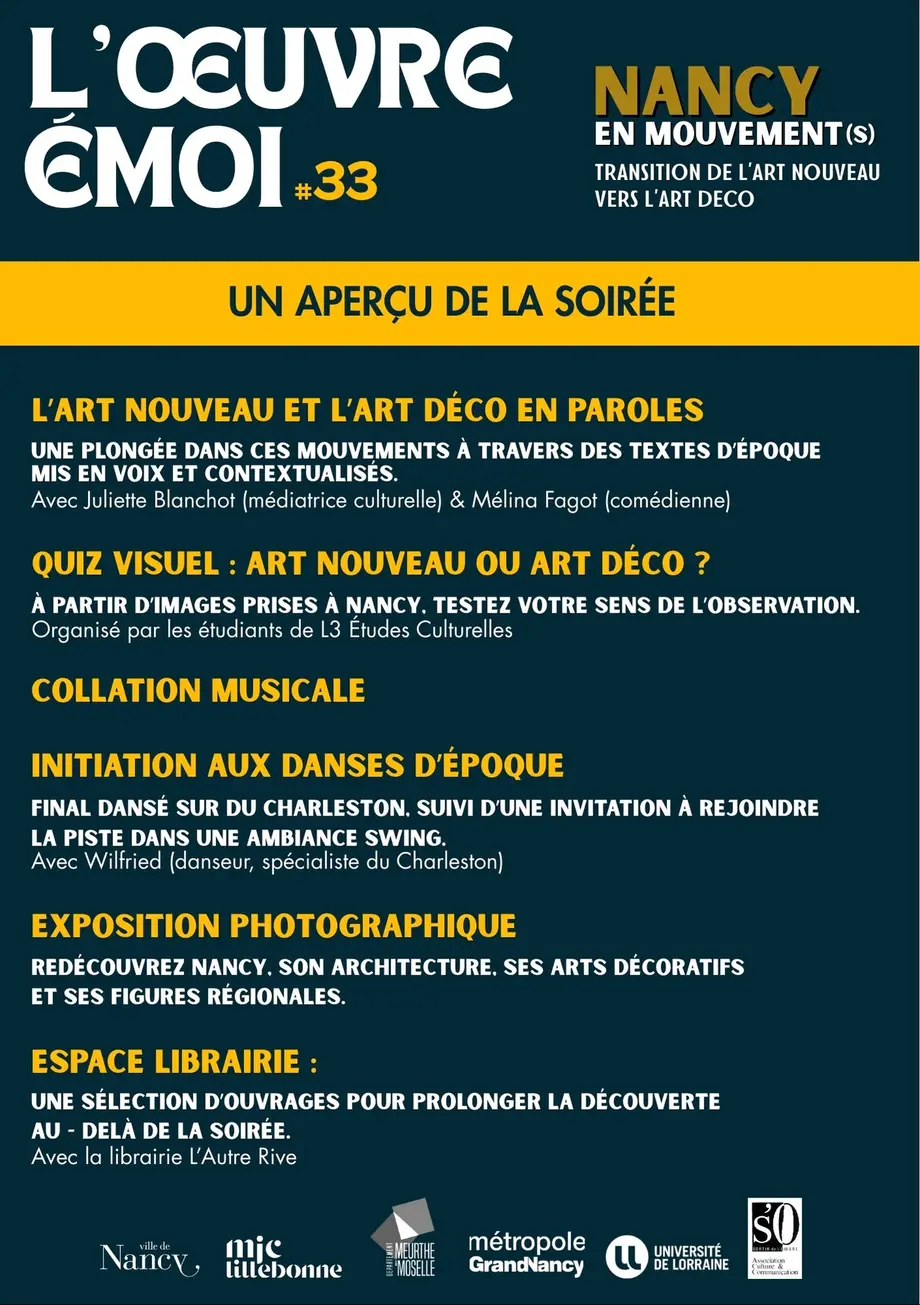 - "À Nancy, l’Art Nouveau et l’Art Déco ne s’opposent pas mais se répondent. La ville constitue un terrain privilégié pour observer la transition entre ces deux esthétiques, du décor inspiré par la nature aux lignes plus sobres et géométriques. Aborder ces mouvements conjointement permet de mettre en lumière une continuité artistique et historique, tout en interrogeant les mutations culturelles, techniques et sociales qui ont marqué le début du XXe siècle. Cette soirée propose une immersion au cœur de l’Art Nouveau et de l’Art Déco, deux courants majeurs qui ont profondément marqué l’identité artistique de Nancy et de sa région. Pensée comme un moment de découverte et de convivialité, l’événement invite chacun à explorer ces mouvements emblématiques dans une atmosphère chaleureuse et participative."