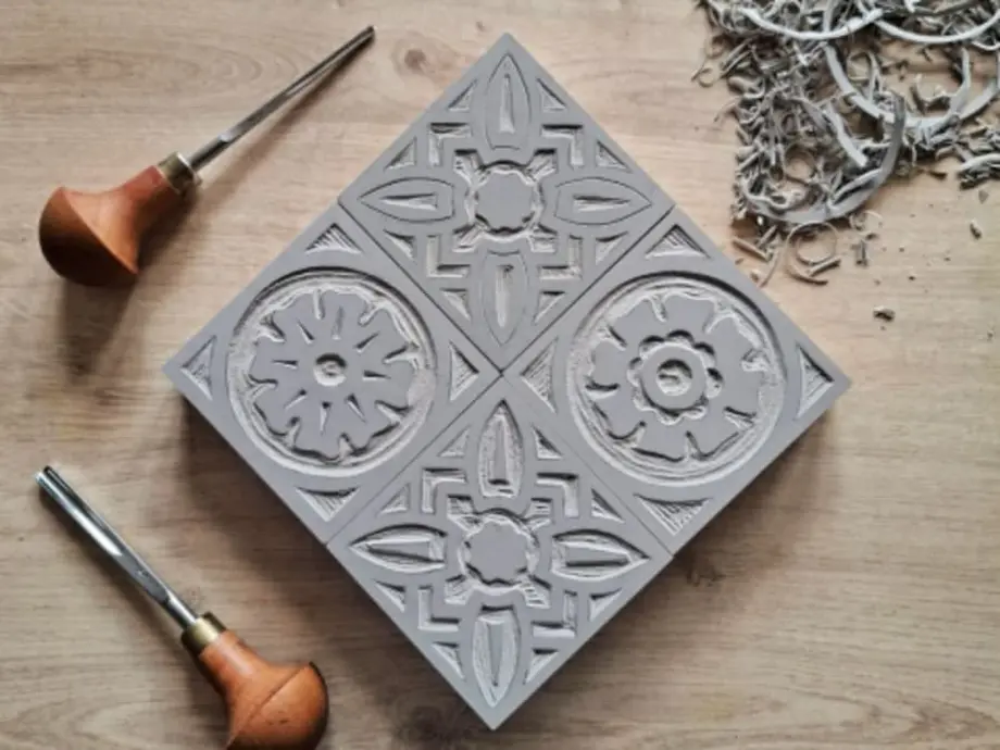 - Une fois votre dessin choisi et transféré sur la gomme avec du papier calque, vous graverez votre tampon à l’aide de gouges.