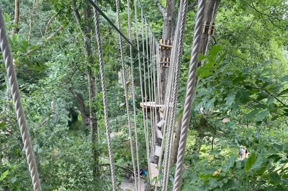 Parcours de cordes en plein air avec des plates-formes et des ponts en bois au milieu de grands arbres dans un parc.