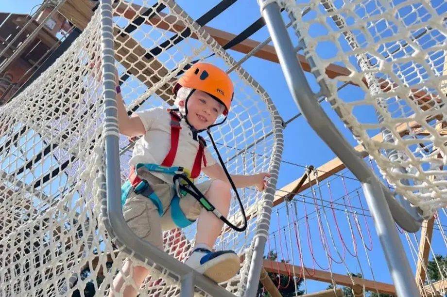 Un enfant portant un casque et un harnais de sécurité escalade une structure de filet en corde sous un ciel bleu clair.