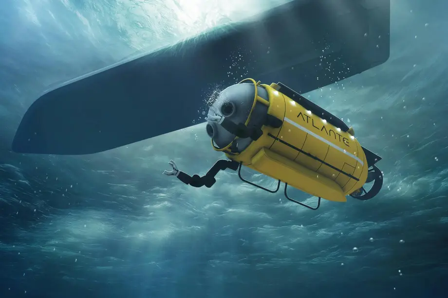 Un véhicule sous-marin jaune étiqueté "ATLANTE" explorant sous une structure immergée dans l'eau bleue de l'océan.