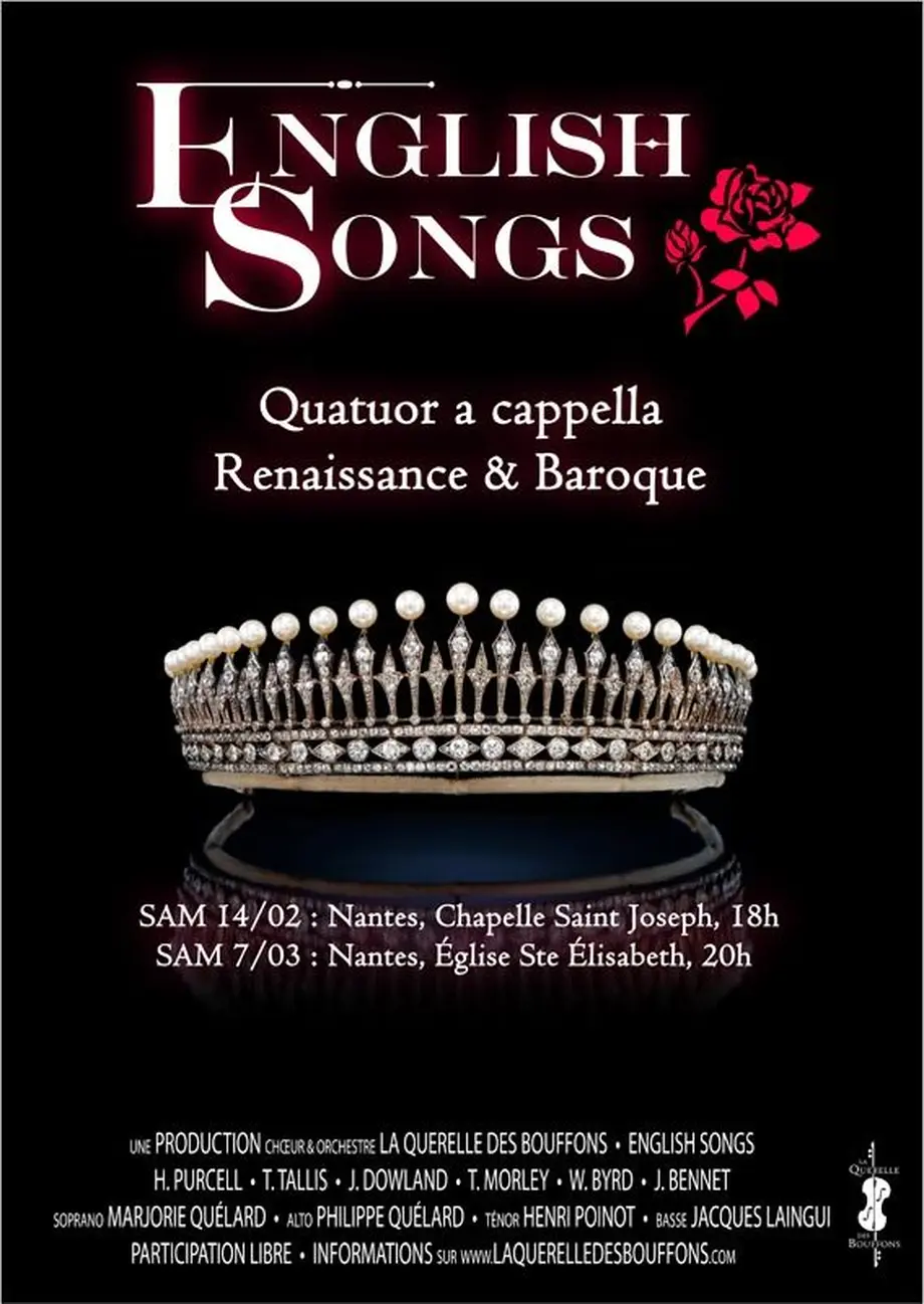 Explorant le passage de la musique Renaissance au style baroque, la Querelle des Bouffons a concocté un programme poétique inspiré par l’amour, pour quatuor a cappella. L’amour de Dieu tout d’abord, avec quelques grandes œuvres sacrées composées par Tallis ou Byrd pour Henry VIII ; l’amour courtois inspiré par le madrigal italien, dont l’influence se fait sentir jusqu'à la cour de la Reine Elisabeth I au travers de Gibbons, Bennett et Dowland ; et enfin l’amour tourmenté mis en scène par Purcell, l’opéra baroque inspiré par les amours mythologiques d’Arthur ou des grandes héroïnes shakespeariennes.