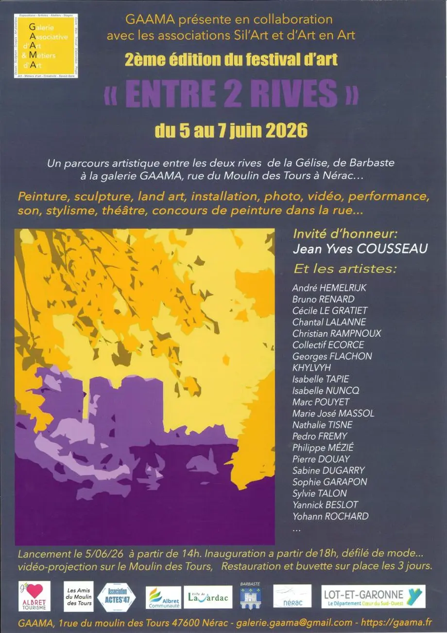 Le festival d’art Entre 2 Rives revient pour une deuxième édition et vous invite à un véritable parcours artistique entre les deux rives de la Gélise, de Barbaste à la galerie GAAMA, à Nérac.