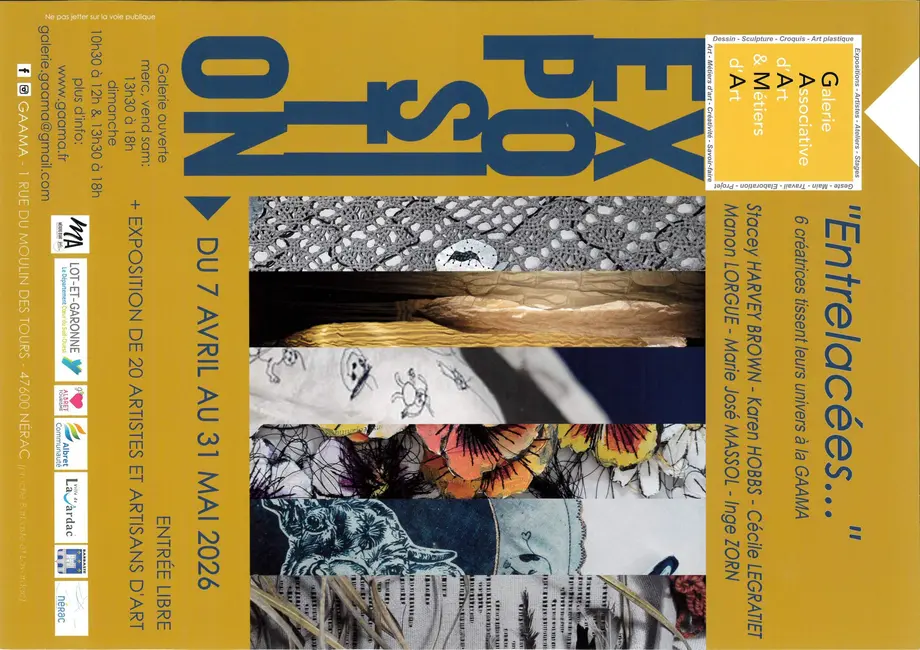La Galerie Associative d’Art et Métiers d’Art (GAAMA) accueille l’exposition « Entrelacées… », réunissant six créatrices qui tissent et croisent leurs univers artistiques autour du fil, de la matière et du geste. À travers leurs œuvres, Stacey Harvey Brown, Karen Hobbs, Cécile Legratiet, Manon Lorgue, Marie José Massol et Inge Zorn invitent le public à découvrir des approches sensibles et variées de la création textile et artistique.
