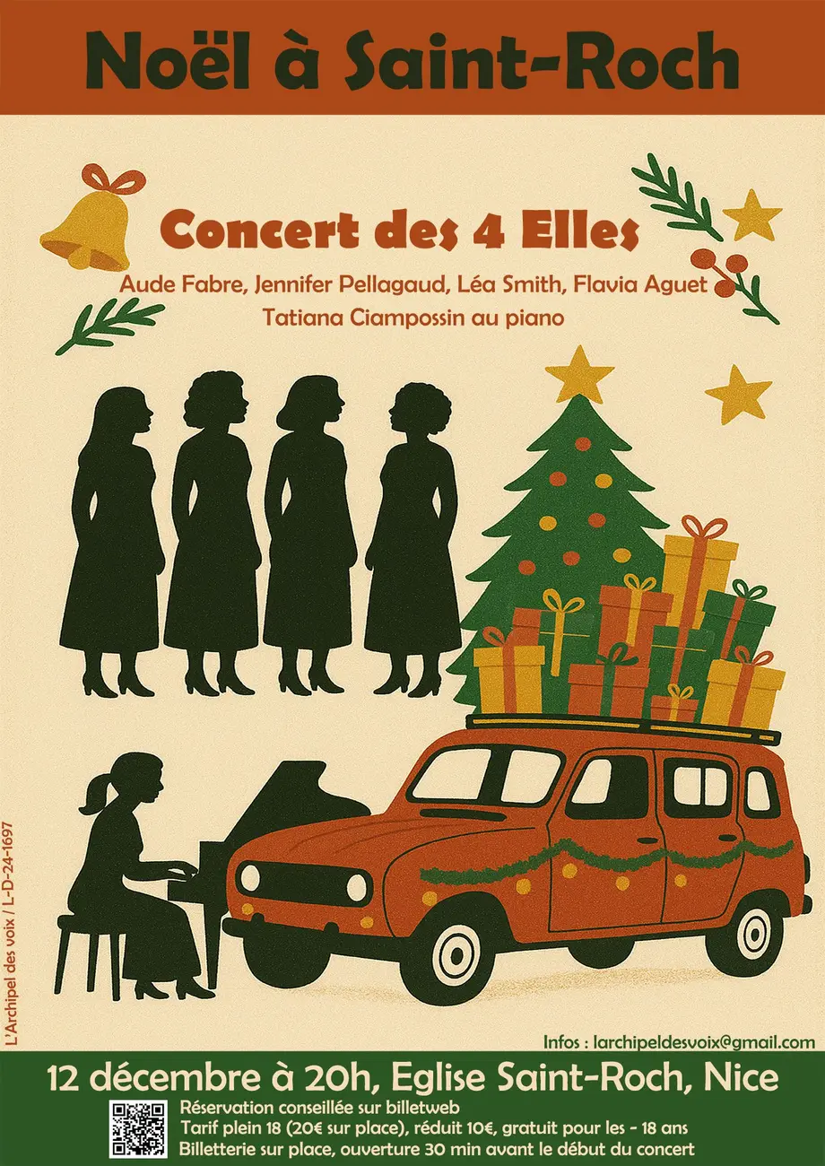 Venez vivre un moment exceptionnel avec le fabuleux concert de Noël des 4 Elles, un véritable hymne à la joie de Noël ! Ce concert promet d'être un instant de magie et de communion musicale, mettant en avant les superbes voix lyriques des 4 Elles.