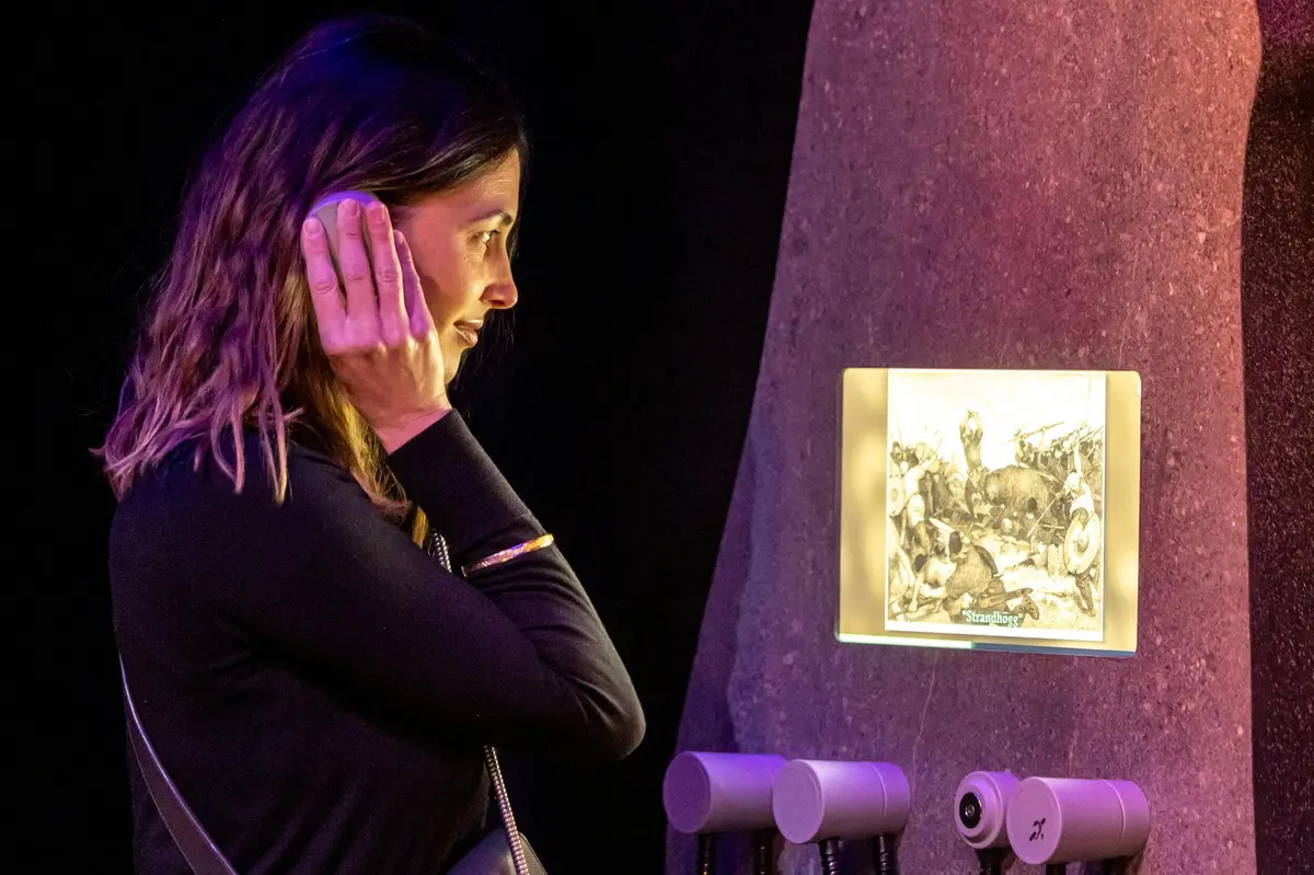 Un présentoir avec une proue de navire viking, un bouclier et un écran montrant des acteurs dans une scène dramatique, le tout entouré d'un éclairage tamisé.