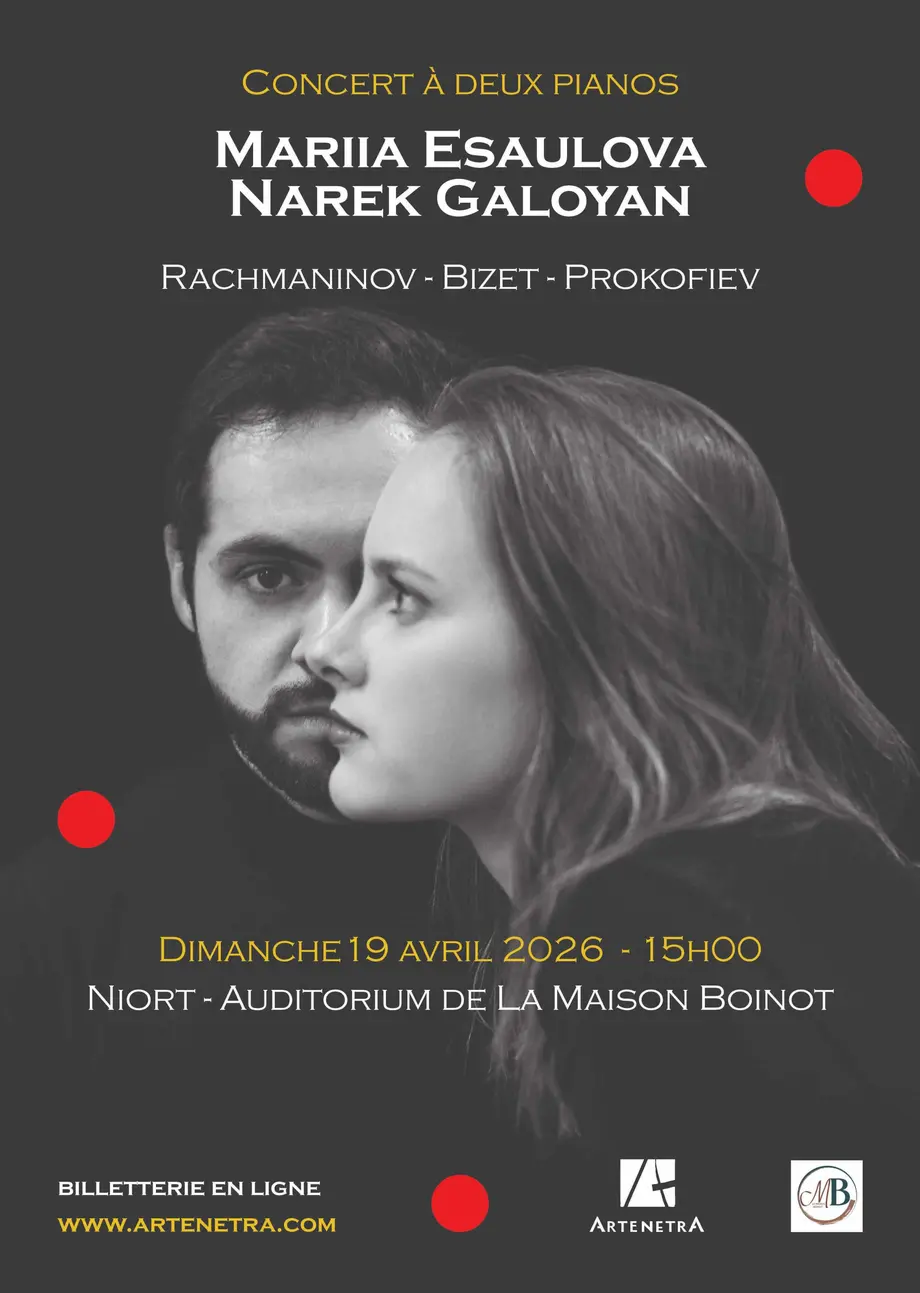 Récital exceptionnel à deux pianos par Mariia Esaulova et Narek Galoyan, dans un programme virtuose : œuvres de Rachmaninov, de Bizet (fantaisie sur l’opéra Carmen) et de Prokofiev (suite du ballet Cendrillon).