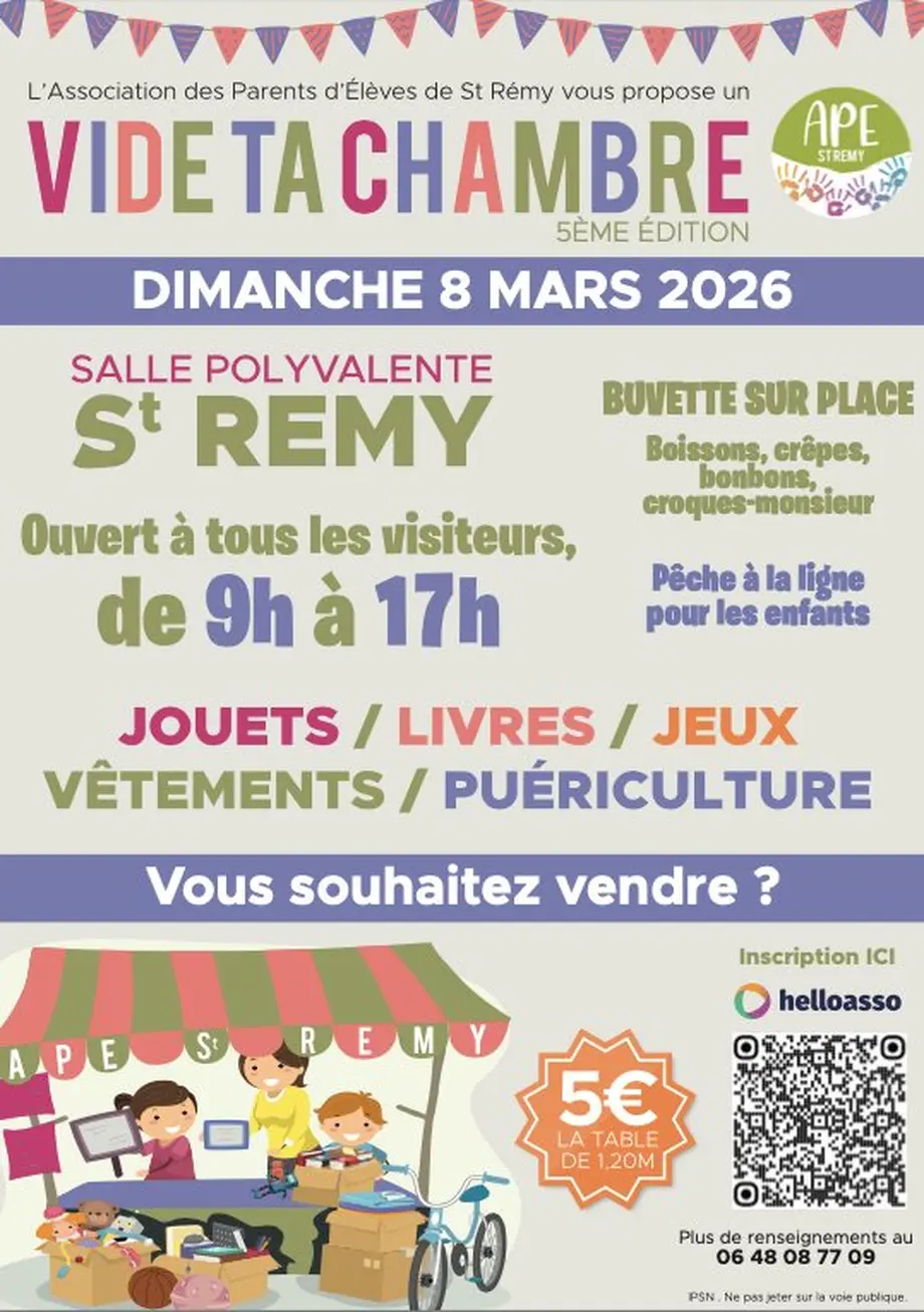 L’APE de Saint-Rémy (École Maison de la Plaine) vous propose la 5e édition de son « Vide ta chambre » le dimanche 8 mars, de 9 h à 17 h, à la salle polyvalente de Saint-Rémy, afin d’aider au financement des projets éducatifs de l’école.
