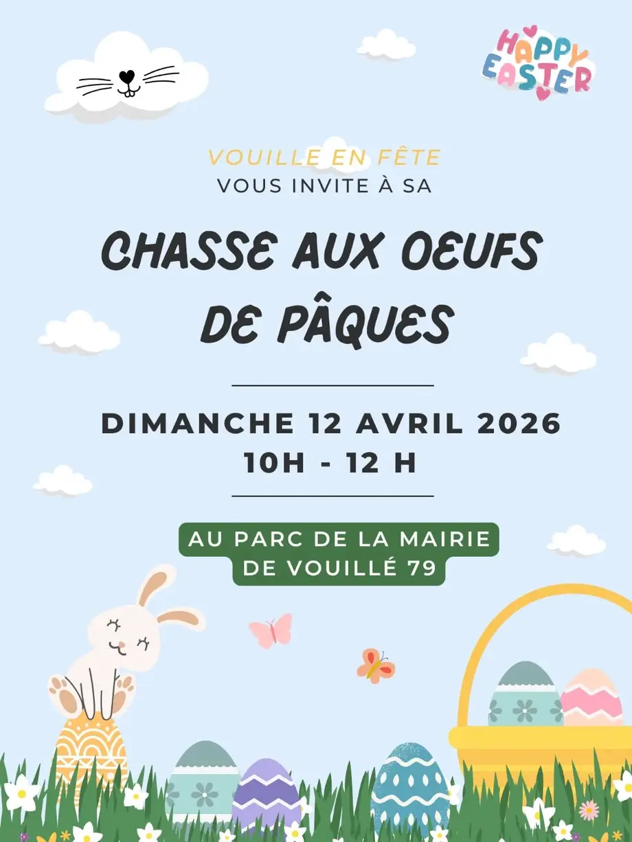 Retrouvez Vouillé en Fête, le dimanche 12 avril 2026, au parc de la mairie de Vouillé, près de Niort, à partir de 10 h, pour la traditionnelle chasse aux œufs de Pâques.