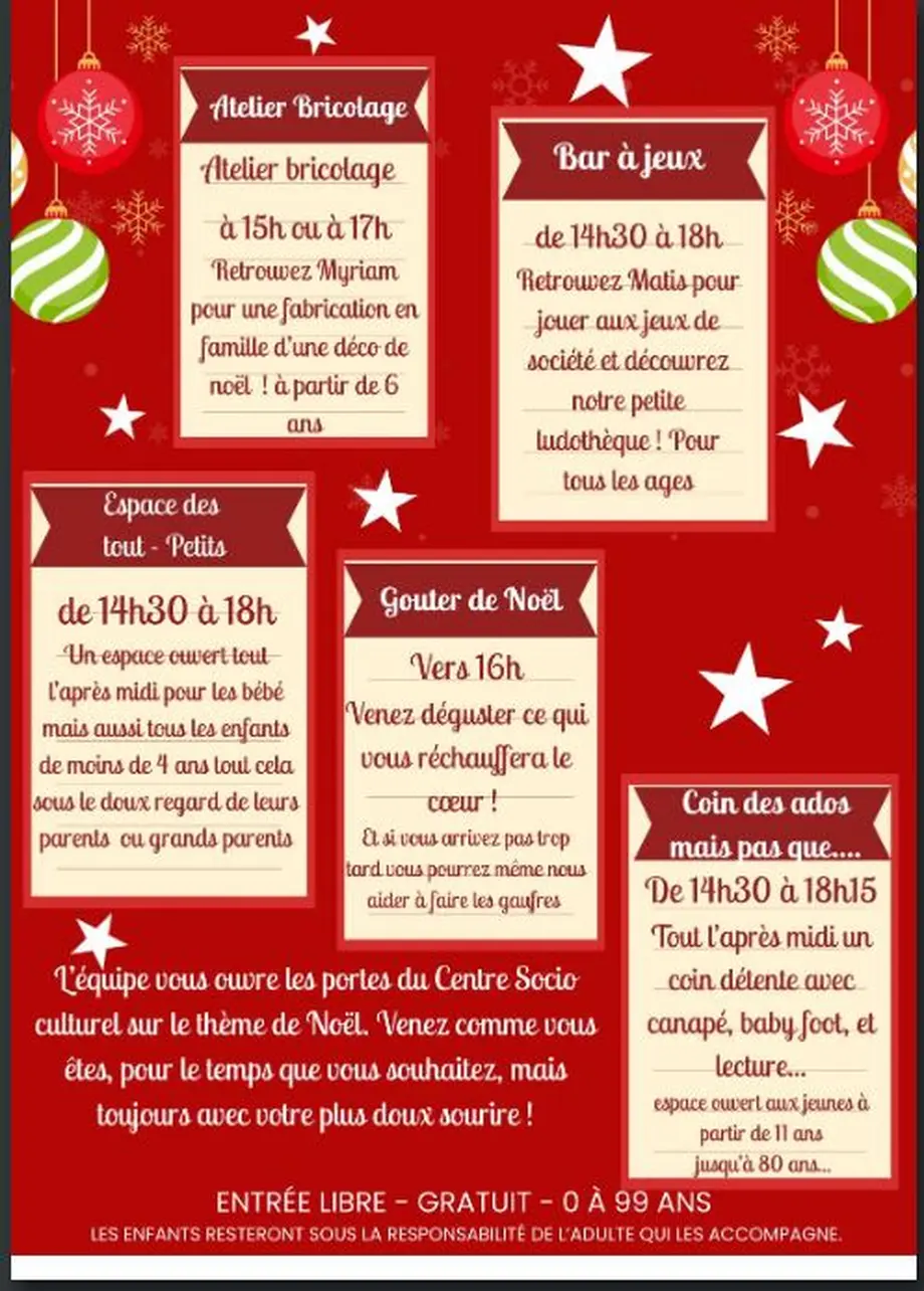 L'équipe du Centre Socio Culturel vous propose un après-midi dans l'ambiance de Noël. Nous vous accueillerons le temps d'un atelier, le temps d'un goûter, le temps de papoter, le temps de jouer, le temps que vous avez… dans une ambiance conviviale, au Centre Socio Culturel.
