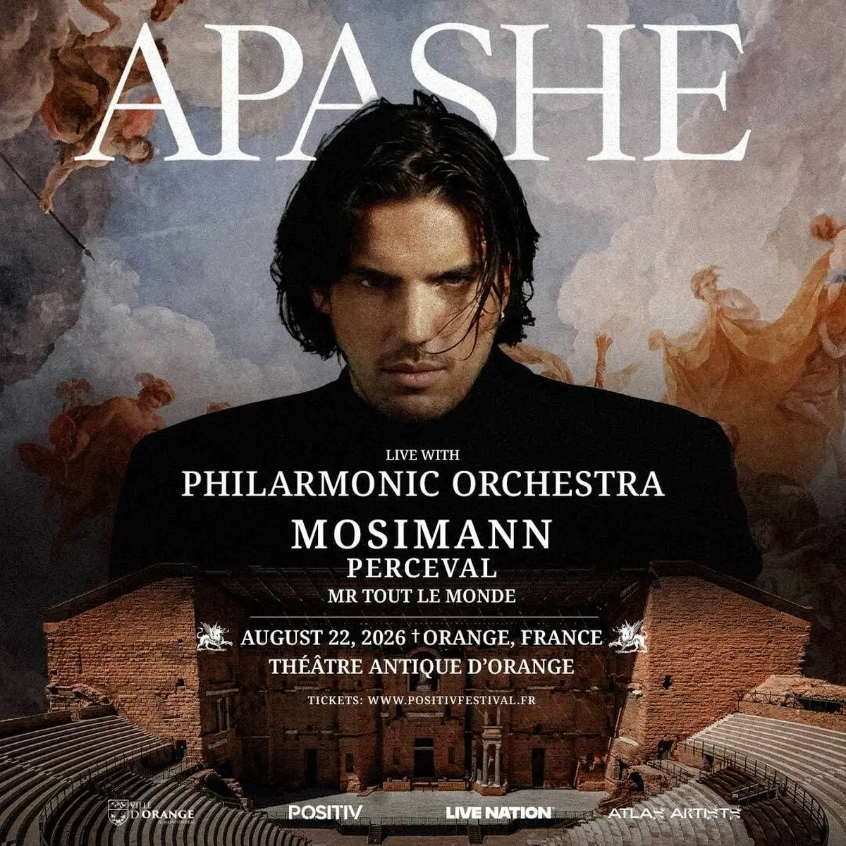 Le festival POSITIV Orange 2026 présente un événement exceptionnel le samedi 22 août 2026 au Théâtre Antique d'Orange. Cette soirée unique réunit Apashe accompagné d'un orchestre philharmonique complet, aux côtés de Mosimann, Perceval et Mr Tout le Monde.