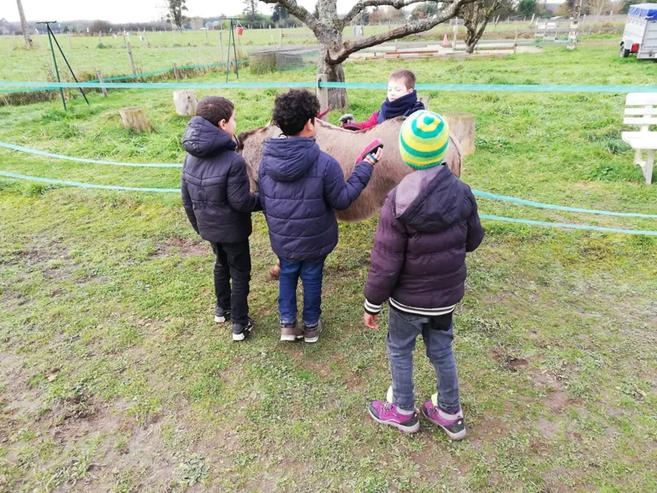 Rencontre avec les ânes pour apprendre à les connaître, à les brosser et, bien sûr, à les mener sur un petit parcours puis dans le village.