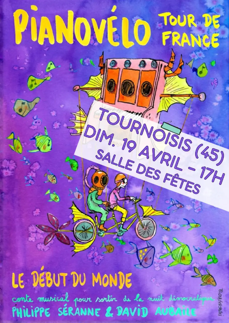 Philippe Séranne et David Aubaille font le tour de France à vélo en tractant 250 kg de piano… Pour célébrer en musique les centaines de collectifs qui reprennent en main la démocratie partout en France ! Ils jouent, chantent, amusent, et l’impensable devient possible : le verbe enflamme les consciences et la virtuosité déchaîne les imaginaires. Des paroles fortes qui sonnent juste, une joie qui emporte le désespoir et ouvre une fenêtre de liberté dans nos quotidiens assoupis… Un spectacle qui regonfle les mollets et le moral !