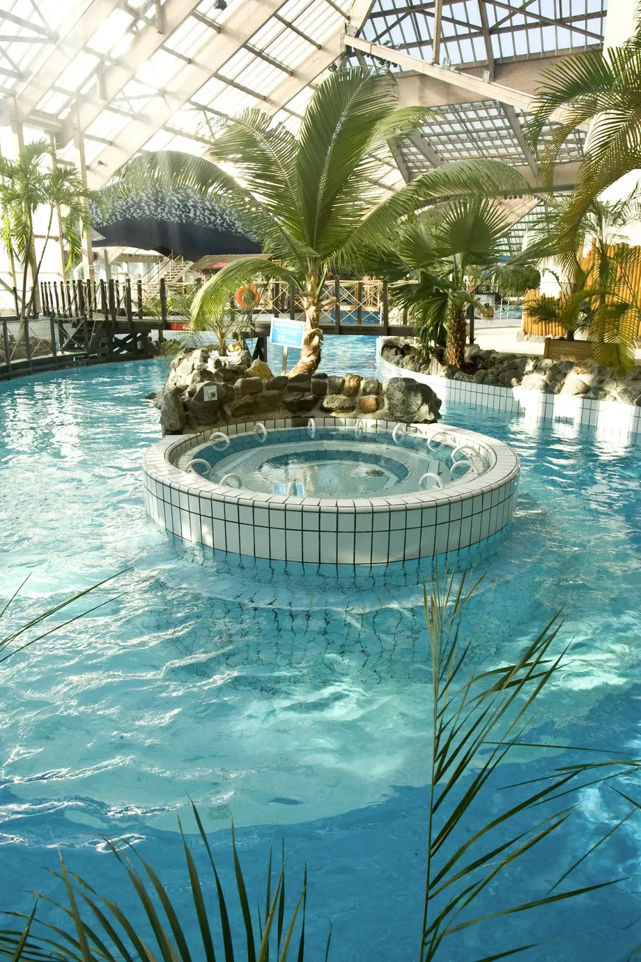 Parc aquatique intérieur avec une grande piscine, des palmiers, des chaises longues et un toboggan bleu. Plusieurs personnes sont dans l'eau.
