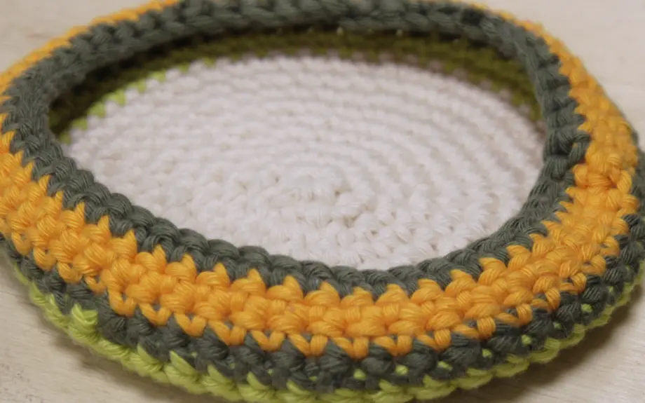 Photographie d’une panière tricotée en trapilho lors d’un atelier créatif.