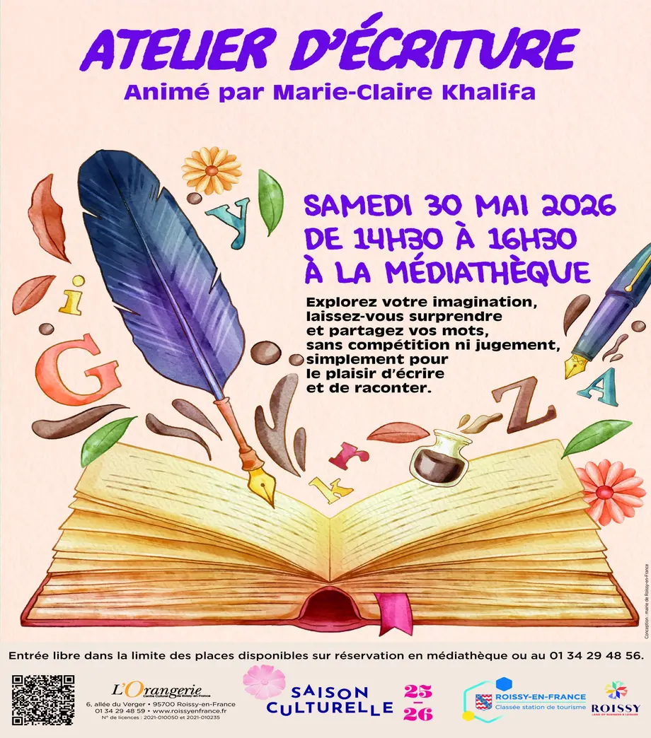 Le cycle d'ateliers d'écriture animé par Marie-Claire Khalifa est prévu le samedi 30 mai 2026 de 14h30 à 16h30 à L'Orangerie.