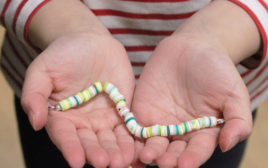 Photographie des mains d’une petite fille tenant un bracelet lors de l’atelier spécial enfant : bijoux.