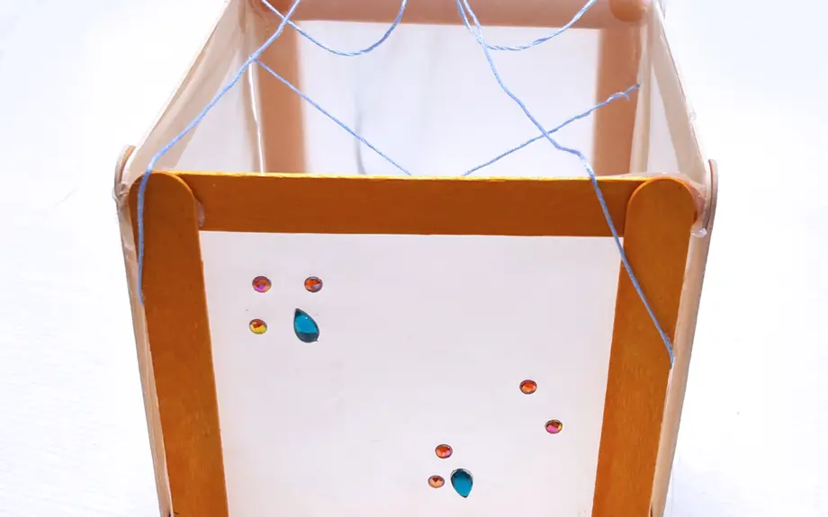 Photographie d'une lanterne de la forêt orange créée à partir de papier calque, de bâtonnets et de strass.