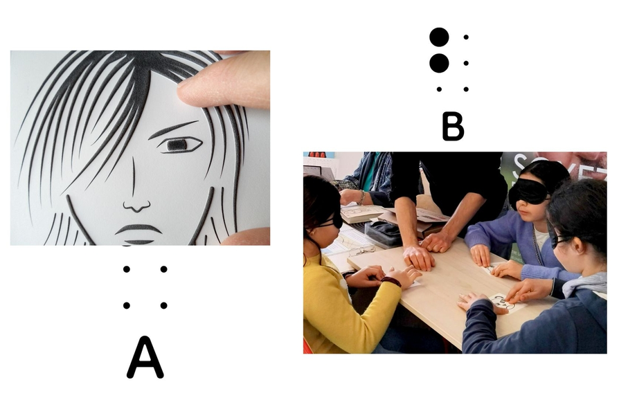 Atelier de découverte de l'image tactile, avec des portraits en relief de smileys et de mangas, les yeux bandés.