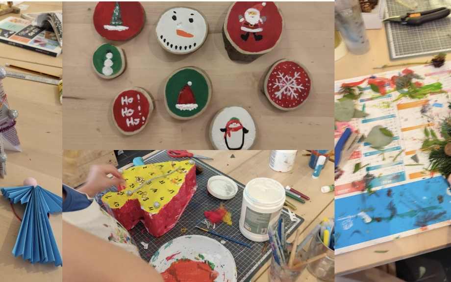 - Après-midi (14 h – 16 h 30) : Noël magique & matières naturelles. Décorations d’hiver sur rondelles de bois et/ou papier : aquarelle, Posca, tampons neige ; suspension pour sapin.