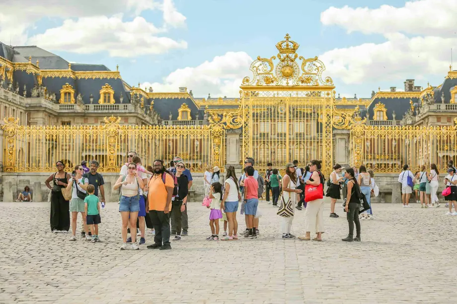 Les visiteurs se rassemblent devant les portes ornées d'un grand palais historique sous un ciel partiellement nuageux.