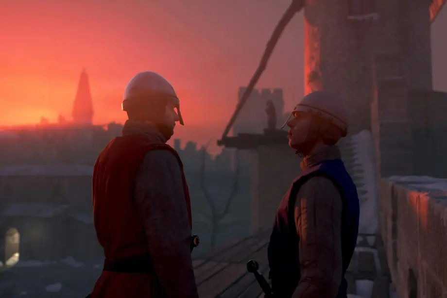 Deux soldats médiévaux portant des casques et des armures discutent sur les remparts d'un château au coucher du soleil, avec une tour lointaine en arrière-plan.