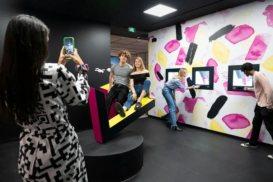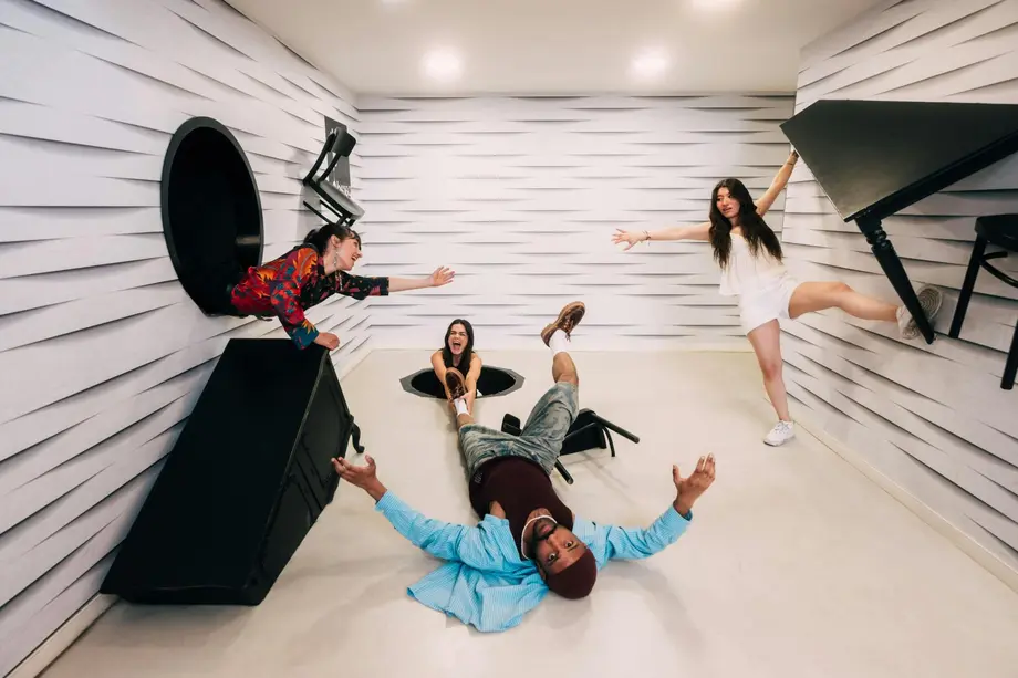 Quatre personnes interagissent dans une pièce ludique et inclinée avec des illusions d'optique, avec un mur conçu pour ressembler à un sol.