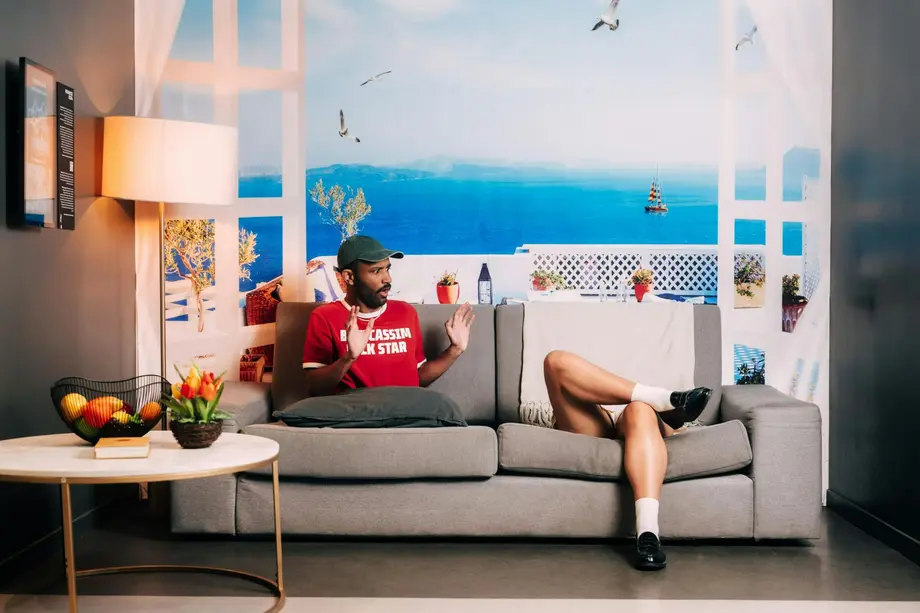 Deux personnes assises sur un canapé gris dans une pièce au décor côtier, une table d'appoint avec des fleurs et des fruits à proximité.