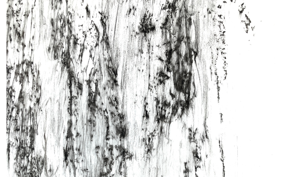 Dans l’exposition Arborescences, Linda Williams poursuit une exploration des paysages « hybrides » : des sites naturels marqués par l’empreinte humaine. Elle a principalement travaillé sur des zones de coupe rase en Suède, ainsi que sur un ancien site minier. À partir de fragments de bois collectés sur des arbres marqués par l’exploitation, l’artiste fabrique ses propres fusains et pigments. Une fois broyés en une poussière fine, elle les disperse dans l’eau pour saturer le papier ou la toile. Ce processus donne naissance à des silhouettes éthérées de troncs et à des paysages imaginaires — qui se font, d’une certaine manière, l’écho des lieux mêmes dont la matière a été extraite. Linda explore ainsi l’idée que de nouveaux paysages émergent directement des matériaux issus des sites originels. Ce cycle de création perpétue l’idée que de nouveaux espaces hybrides naissent de son interaction avec le territoire.
