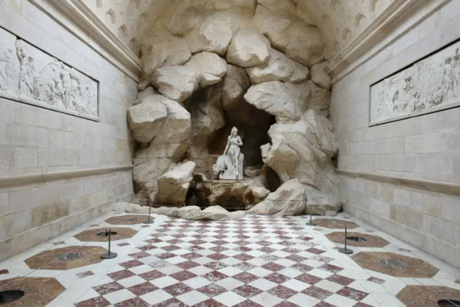 Statue d'une femme et d'un enfant dans une alcôve rocheuse au fond d'un couloir au sol en damier dans une pièce aux murs de pierre.