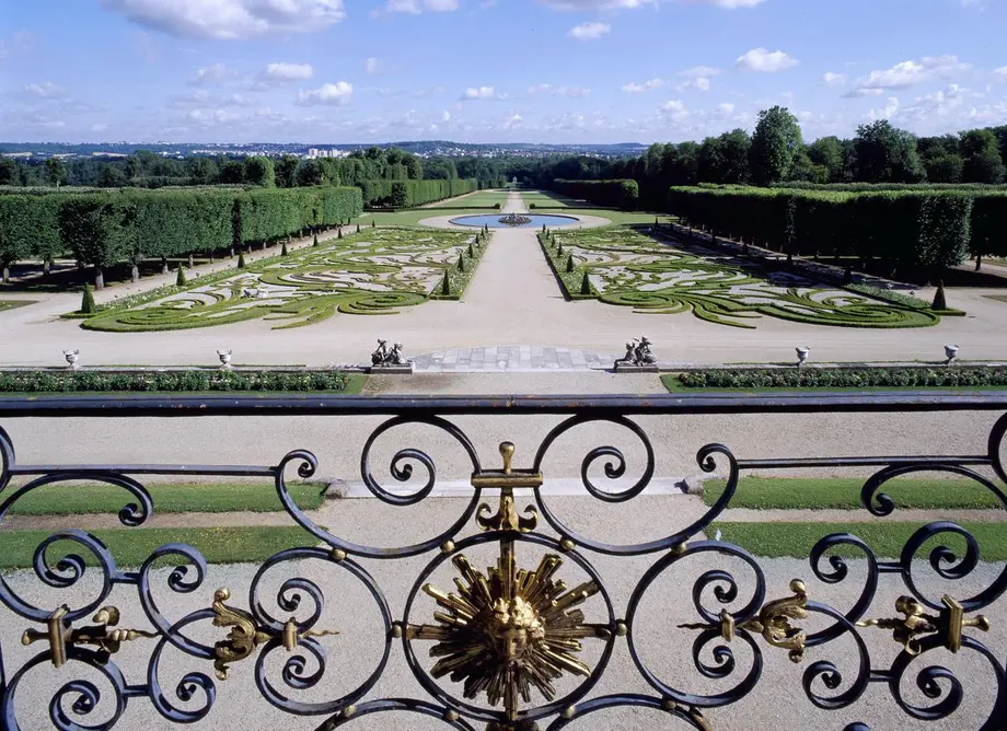Jardin orné de haies soignées, d'allées, de statues et d'une pièce d'eau centrale, vu de derrière une clôture complexe en fer forgé.