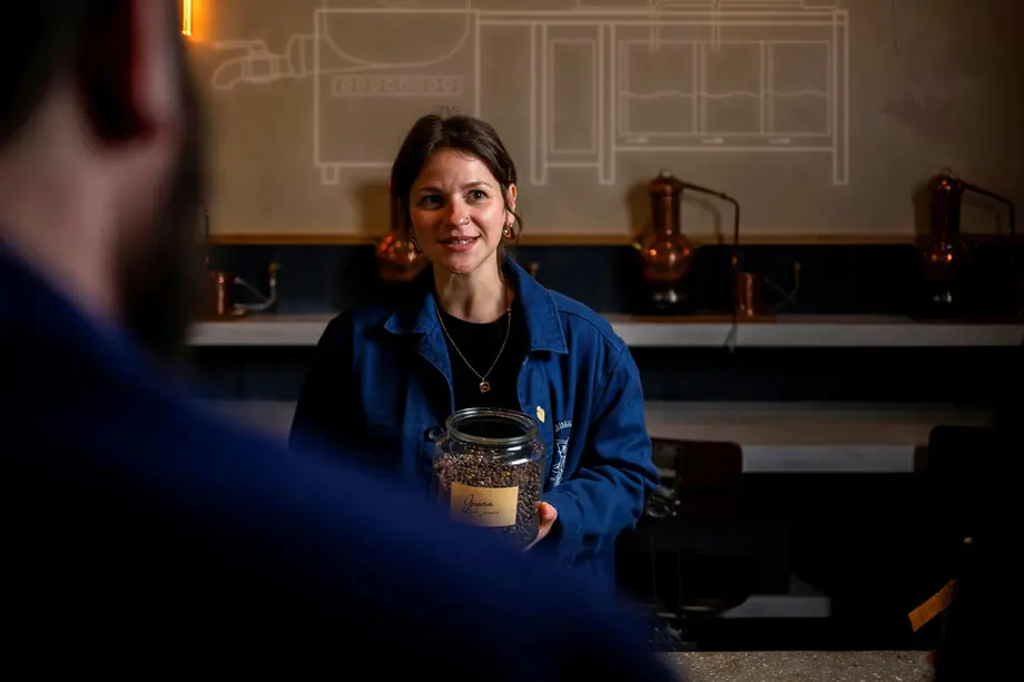 Une femme en veste bleue tient une jarre et parle, avec un bar et un décor en laiton en arrière-plan.
