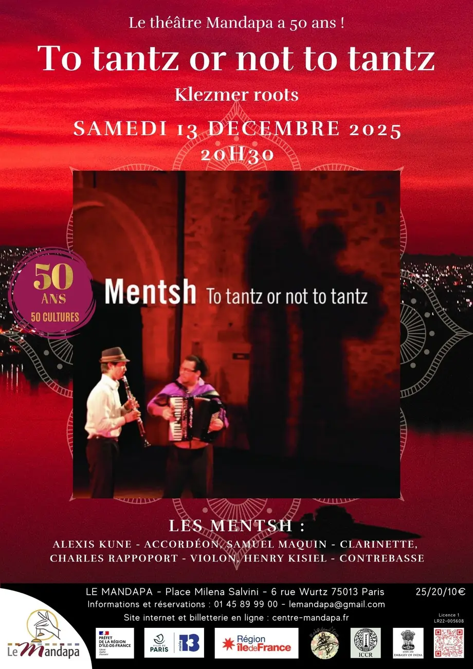 Le duo français Les Mentsh propose son spectacle Klezmer Roots - To Tantz Or Not To Tantz au Théâtre Mandapa de Paris le samedi 13 décembre 2025 à 20h30. Cette création musicale puise dans la tradition klezmer d'Europe de l'Est tout en y apportant des influences contemporaines. Fidèle à l'esprit festif et nomade du genre, ce concert oscille entre euphorie et recueillement, proposant un voyage musical tendre, poétique et dansant. Les billets sont disponibles à partir de 27,50 € pour cette soirée exceptionnelle dans le 13ème arrondissement parisien.