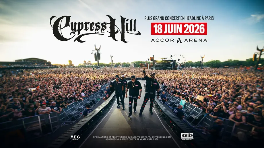 Les légendes du hip-hop Cypress Hill donnent leur plus grand concert le jeudi 18 juin 2026 à l'Accor Arena à Paris. Après leur performance remarquée au Hellfest, B-Real, Sen Dog et DJ Muggs reviennent enflammer la capitale avec plus de trois décennies de tubes cultes. La billetterie générale ouvre le mercredi 21 janvier à 10h.