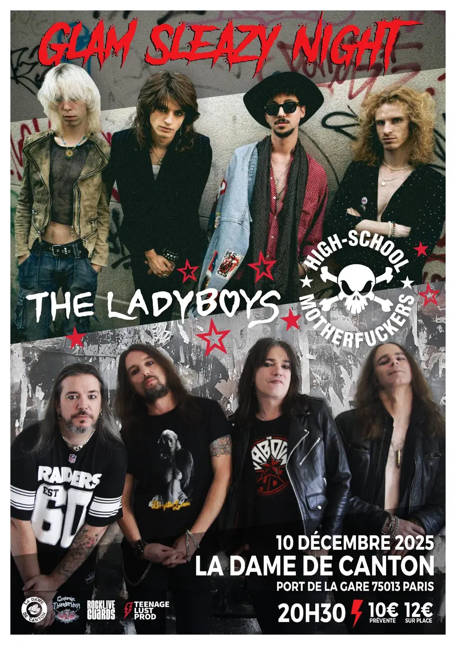 D’abord duo acoustique formé à Lille par Léonard (Adam Bomb, Cobra Spell, Sharx) et Vic (Sharx), l’histoire prend une autre tournure quand ils découvrent une prise électrique dans leur appartement : ils y mettent les 2 doigts, se prennent un bon coup de jus et comprennent que leur destinée sera électrique ou ne sera pas. Ils appellent 2 acolytes Tommy et Alice (Krymson), et hop : The Ladyboys est né. Les concerts et festivals s’enchaînent, 1er EP « Livin’ On A Daydream » enregistré en sortie imminente, les garçons sont prêts à conquérir le monde avec encore plus de glam, encore plus de pop, encore plus de hard-rock. Si Michael Monroe, T. Rex, les Dolls, Mötley, ou encore Tuk Smith vous parle, venez (re)découvrir la force de la jeunesse !
