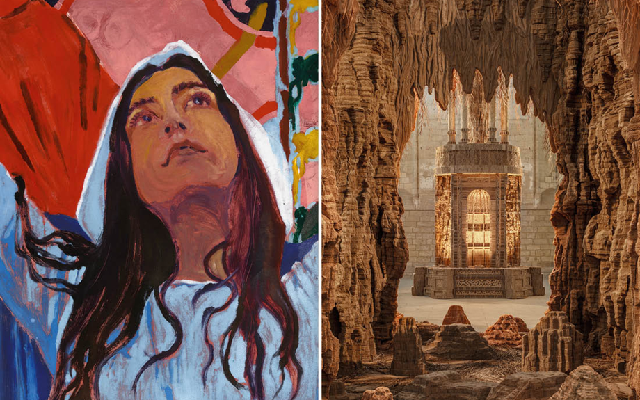 À gauche : Claire Tabouret, Maquette détail © Claire Tabouret © photo Marten Elder 2025 / À droite : Eva Jospin, vue d'exposition Palazzo, 2023, Palais des papes, Avignon © Photo Benoît Fougeirol © Adagp, Paris, 2025
