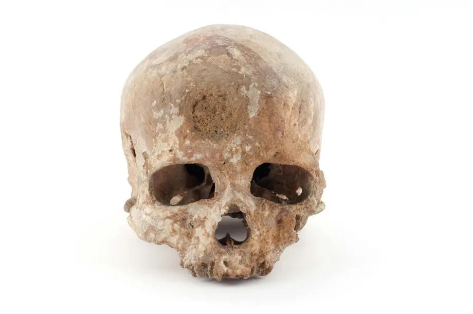 Un crâne humain usé par le temps, avec des dents manquantes, sur un fond blanc uni.