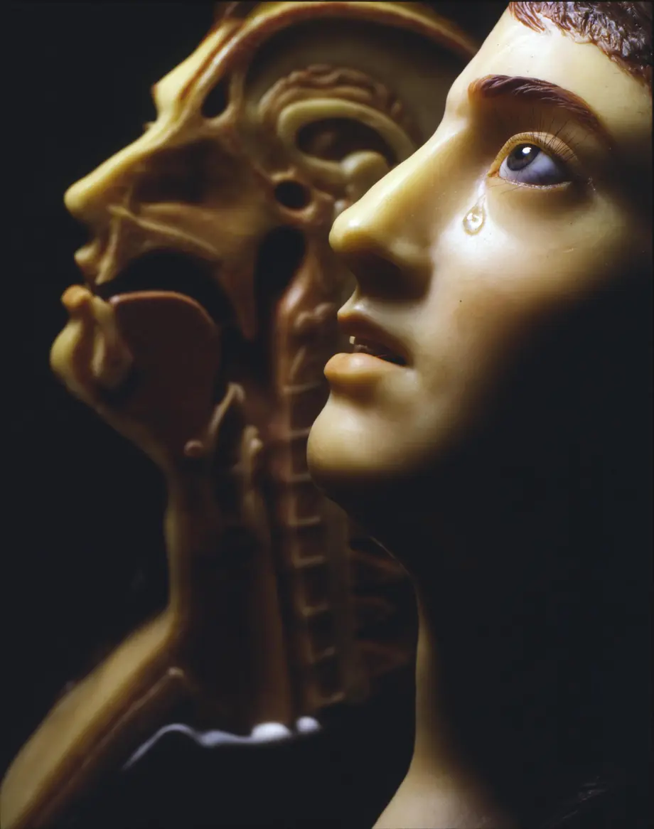 Gros plan d'un modèle anatomique humain avec une déchirure, montrant les structures internes ; un autre modèle est partiellement visible derrière lui.