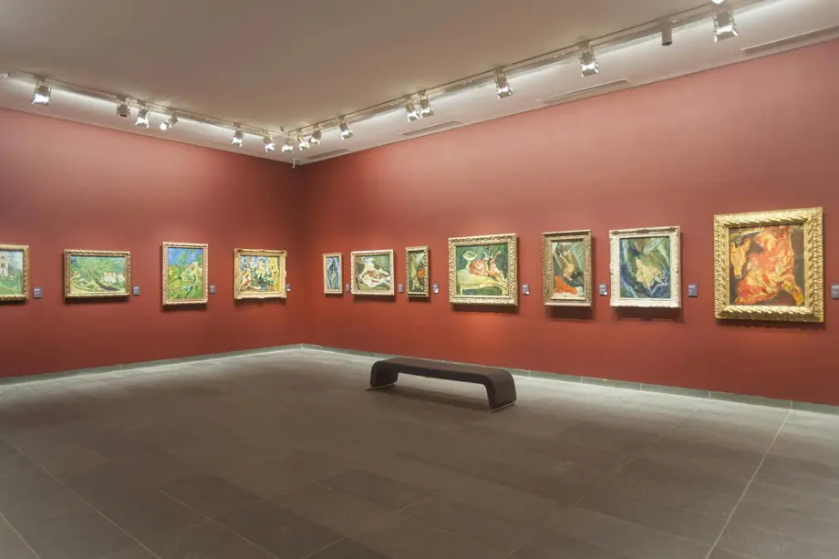 Galerie de musée aux murs rouges où sont exposés des tableaux encadrés. Un seul banc est posé sur le sol carrelé au centre de la pièce.