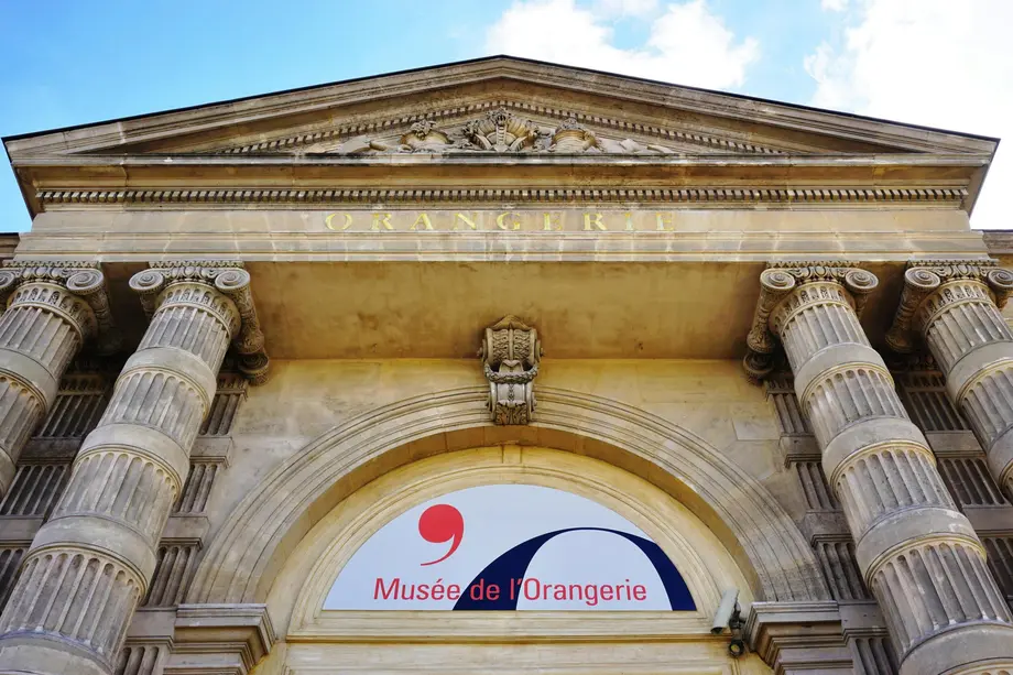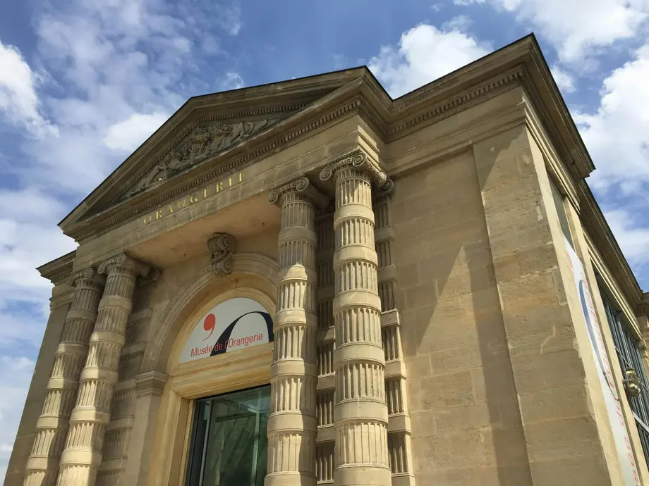 Bâtiment en pierre avec des colonnes ornées et une arche. L'enseigne indique "Musée de l'Orangerie". Ciel bleu avec quelques nuages en arrière-plan.