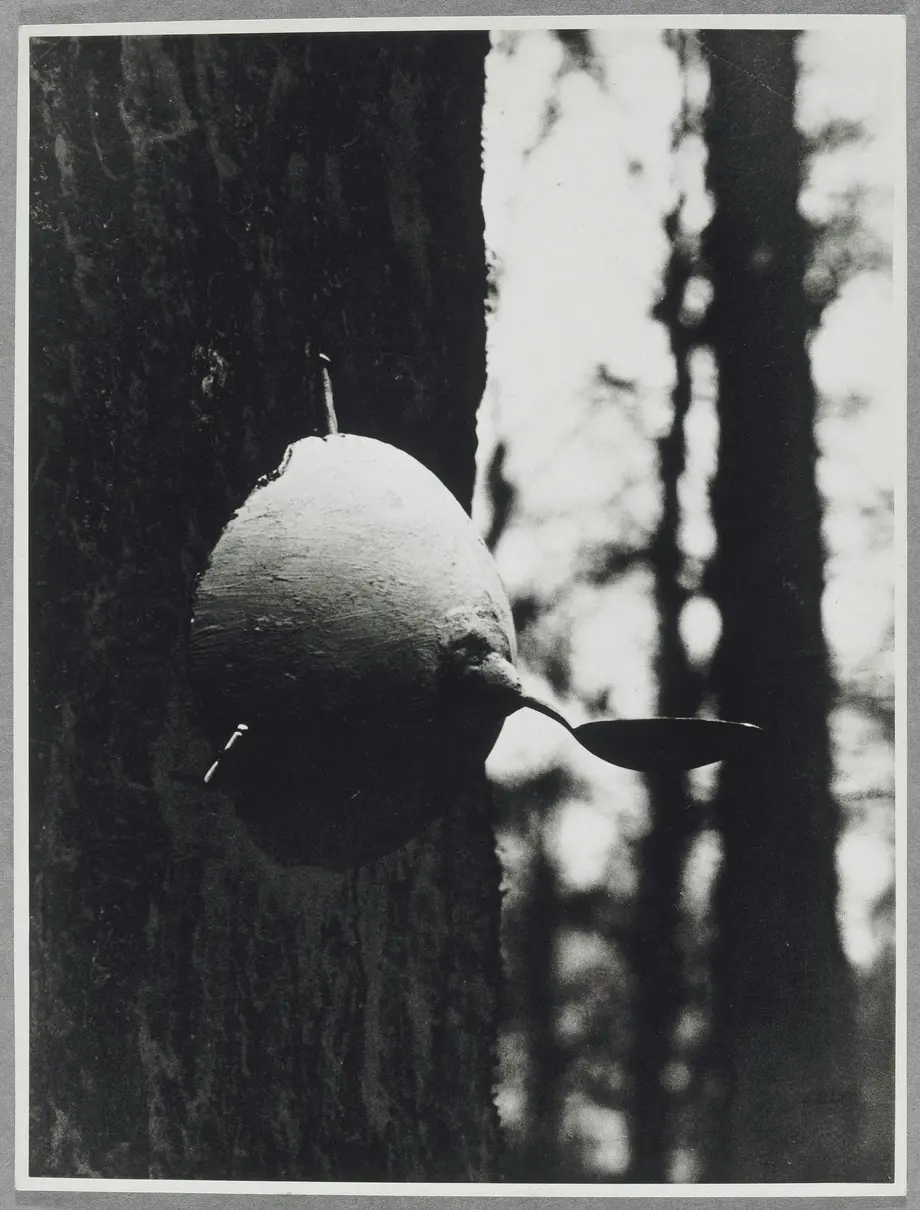 Image en noir et blanc d'une théière fissurée encastrée dans un tronc d'arbre dans une forêt. Des arbres flous sont visibles à l'arrière-plan.