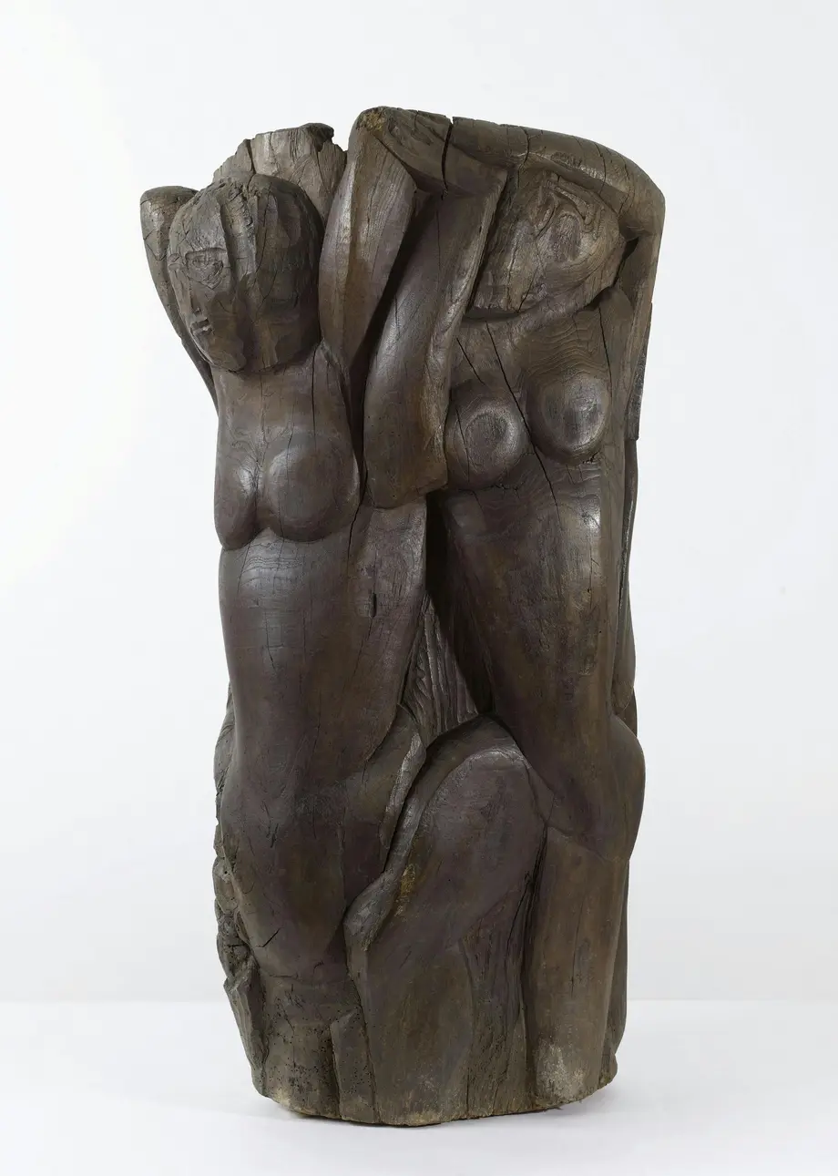 Sculpture en bois sculpté représentant deux figures humaines abstraites dont le torse et la tête sont visibles sur un fond uni.