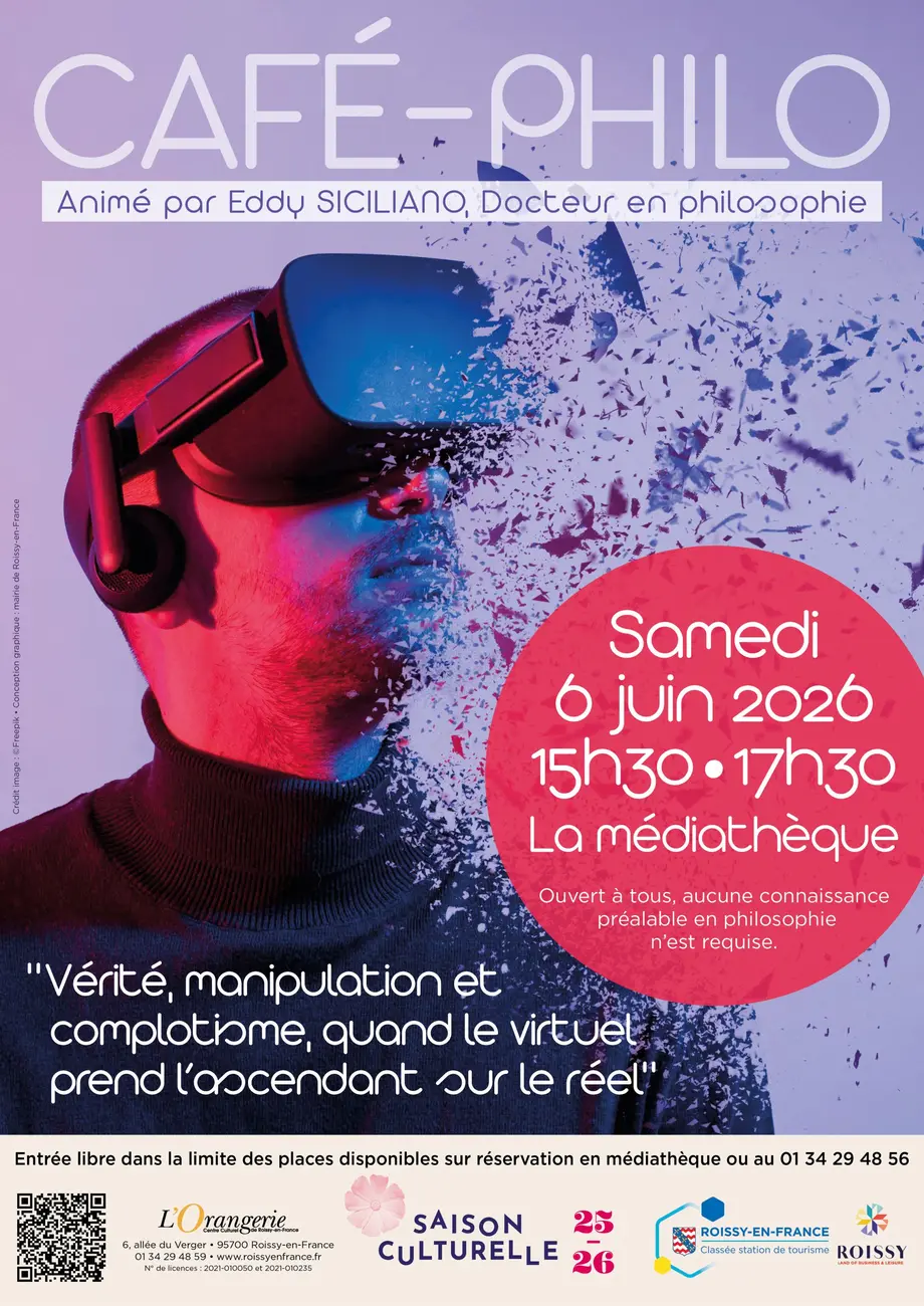 Un café-philo vous est proposé à la médiathèque le samedi 6 juin 2026, de 15h30 à 17h30, animé par Eddy SICILIANO sur le thème "Vérité, manipulation et complotisme, quand le virtuel prend l’ascendant sur le réel."